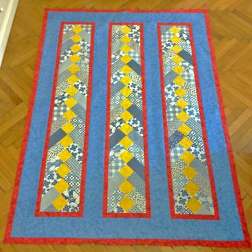 Die Technik ist eine Abwandlung des "Zopf-Quilts" und bietet sich perfekt für die Verarbeitung von vorhandenen Streifen, wie beispielsweise Jelly Rolls aber auch übriggebliebene sonstige Streifen an.