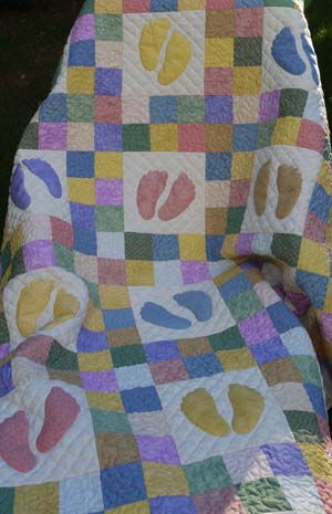 In den Füßchen-Blöcken habe ich zuerst einmal rund um die Füßchen "in der Naht" gequiltet. Dadurch wurde die Kontur gut abgegrenzt.